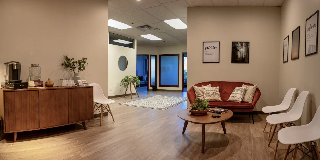 The welcome area when you arrive. Help yourself to complimentary water, coffee, or tea as you wait.